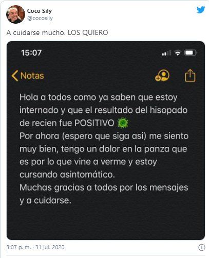 "El resultado del hisopado fue positivo. Me siento muy bien, tengo un dolor en la panza, que es por lo que vine a verme y estoy cursando asintomático", escribió el actor en su cuenta de Twitter respecto de su estado de salud. Además agradeció las muestra de cariño que recibió y pidió a sus seguidores que se cuiden.