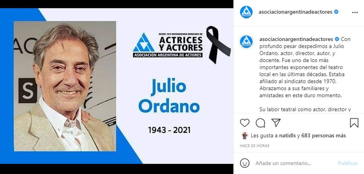 A través de la cuenta Instagram de la Asociación Argentina de Actores se conoció que el actor, docente y director teatral Julio Ordano falleció a los 77 años este lunes. Ordano estaba internado en una clínica de la capital luego que se complicó una enfermedad pulmonar con la que lucho desde hace tiempo.