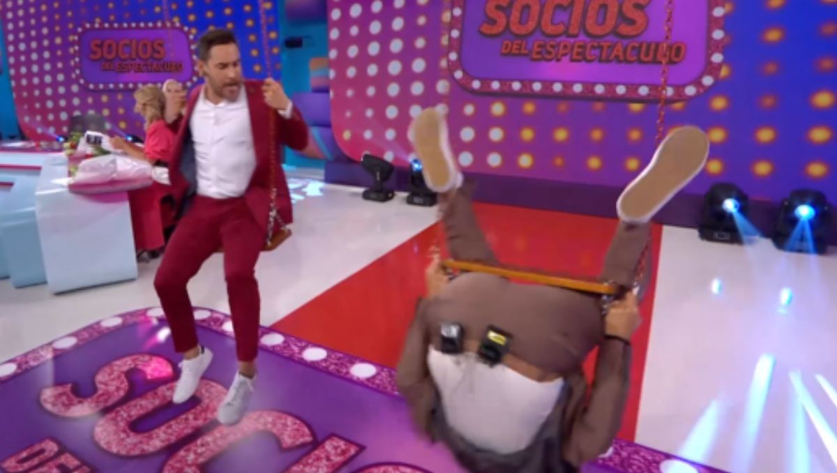 Casi al final del programa, los conductores de "Socios del espectáculo" se sentaron en un par de hamacas dispuestas en el piso sin imaginar lo que pasaría a continuación: Adrián Pallares no pudo controlar la hamaca, se cayó y terminó en el piso "patas arriba".