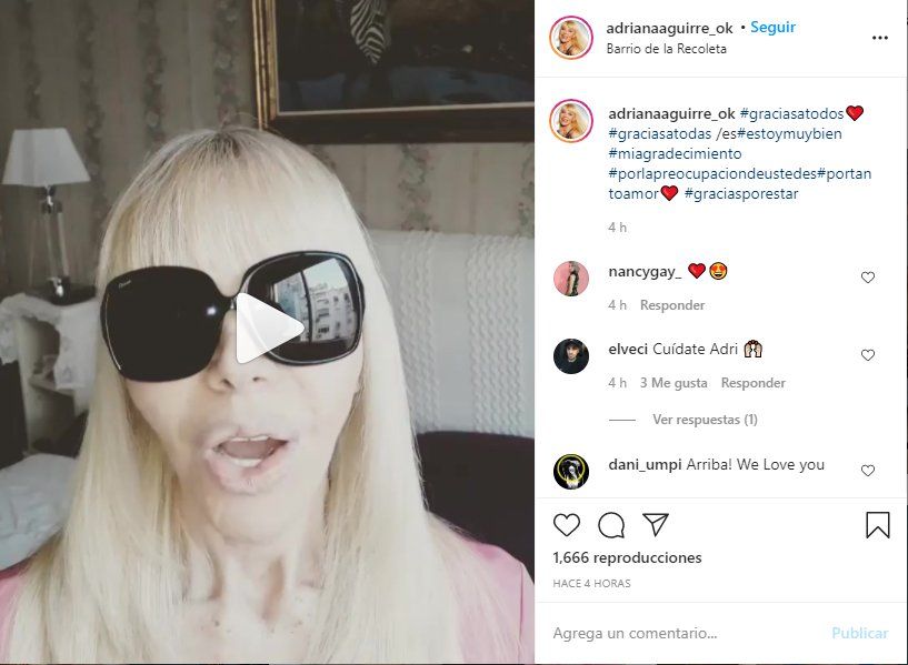 En su cuenta de Instagram, Adriana Aguirre publicó un mensaje este lunes por la tarde donde le dijo a sus seguidores: "Estoy muy bien, en casa, quiero llevarles tranquilidad. Hoy en día el Covid-19 es algo muy corriente y normal y yo me siento bien. Quiero que se queden tranquilos, estoy perfecta. Gracias por la preocupación de todos". Explicó la vedette en el video.