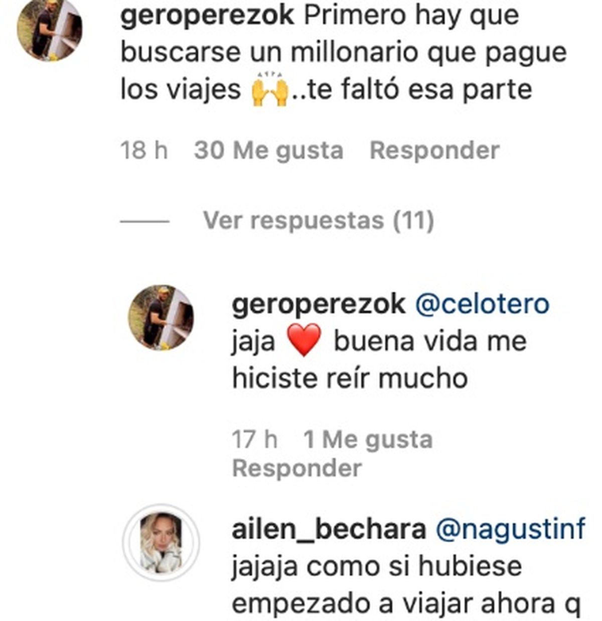 Y el usuario le dijo: “Primero hay que buscarse un millonario que pague los viajes… te faltó esa parte”, le acotó. “Jajaja como si hubiese empezado a viajar ahora que tengo marido, jaja ¡Dios! Qué básicos”, contestó ella siendo contundente.