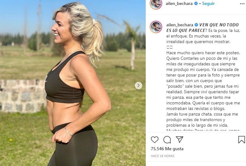 La modelo y Tv host, Ailén Bechara publicó un mensaje de concientización para sus seguidores. Y es que la modelo se dejó de "complejos" y reveló su postura frente a la imagen que mostró de su cuerpo. "No es todo lo que parece", dijo.