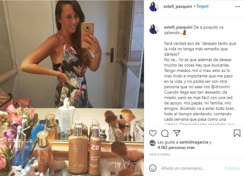Fieles a su estilo, la esposa de Alberto Cormillot, Estafanía Pasquini, usó su cuenta en la red social Instagram para revelar su embarazo. En la foto donde se la ve con un vestido de flores y frente al espejo luciendo su panza, escribió: “De a poquito va saliendo... Será verdad eso de ‘desealo tanto que la vida no tenga más remedio que dártelo’. Yo sé que además de desear mucho las cosas hay que buscarlas. Tengo miedos, mil o más. Esto es lo más lindo e importante que me pasó en la vida, y no podía ser con otra persona que no seas vos”.