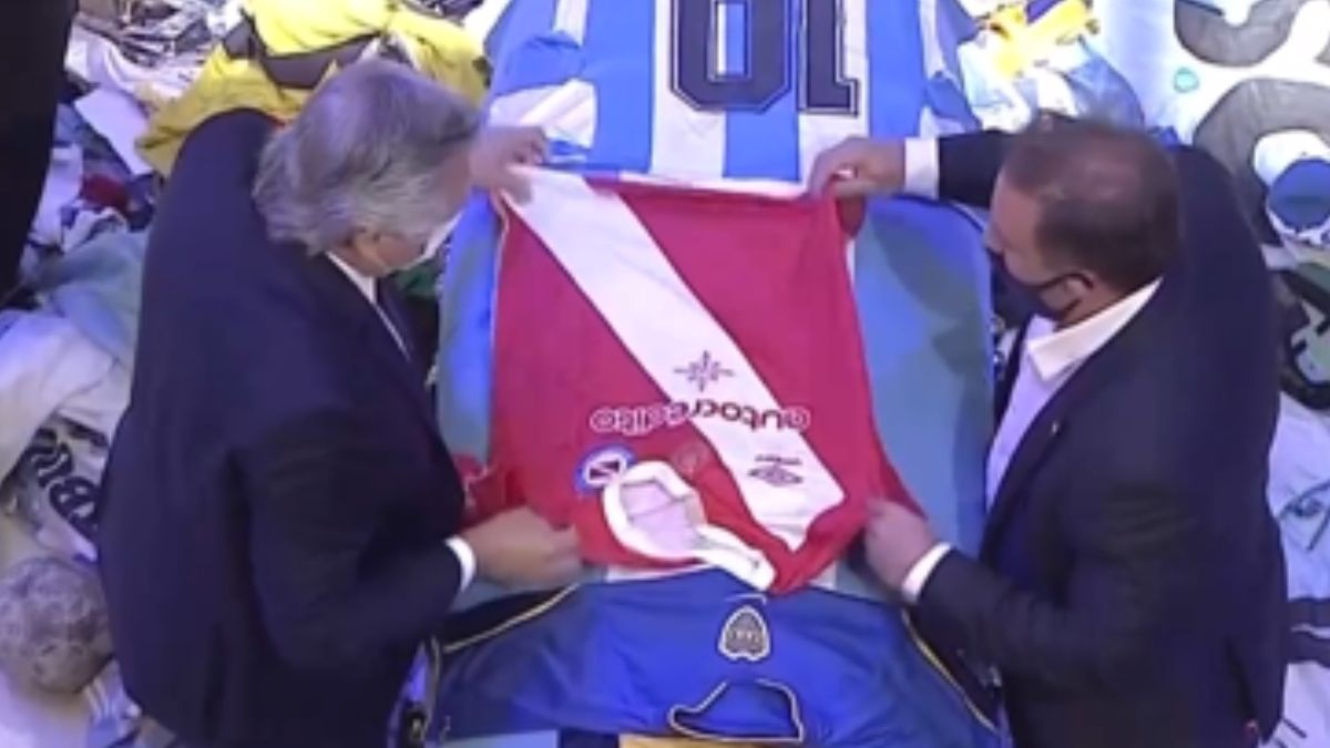 El presidente Alberto Fernández se hizo presente en Casa Rosada y dejó una camiseta de Argentino Juniors en el féretro de Diego Maradona.