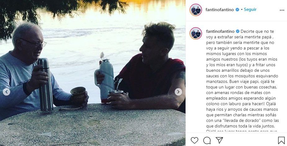 "Decirte que no te voy a extrañar sería mentirte papá , pero también sería mentirte que no voy a seguir yendo a pescar a los mismos lugares con los mismos amigos nuestros (los tuyos eran míos y los míos eran tuyos) y a fritar unos buenos amarillos debajo de unos sauces con los mosquitos esquivando manotazos", comenzó escribiendo el conductor Alejandro Fantino.