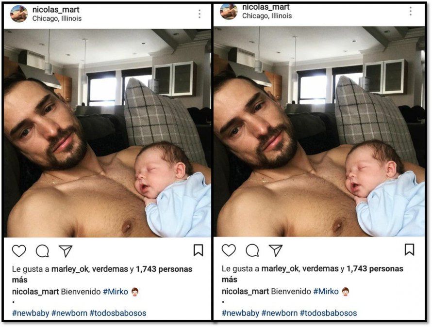 Ayer Nicolás subió un breve video del bebé, apretando levemente su entrecejo para ver el cambio de su rostro, dormido: "Mirko y Mirko (con cara seria y cara alegre). Newborn. Newbaby. Molestos".