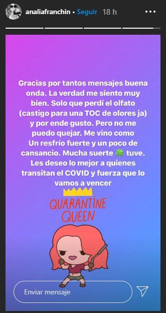 "Pero no me puedo quejar. Me vino como un resfrío fuerte y un poco de cansancio, mucha suerte tuve. Les deseo lo mejor a quienes transitan el coronavirus y mucha fuerza, lo vamos a vencer", agregó Analía Franchín.