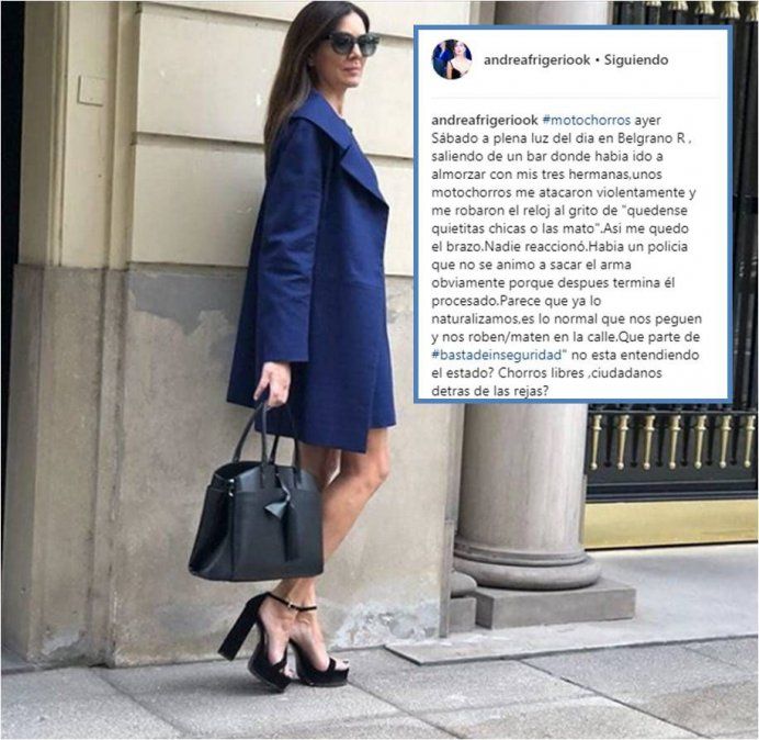 El sábado por la tarde, Andrea Frigerio estaba con sus hermanas en un restaurante de Belgrano. Al salir del lugar, cerca del cruce de vías, fue atacada sorpresivamente por un motochorro que intentó robarle el celular, y finalmente se llevó su reloj.