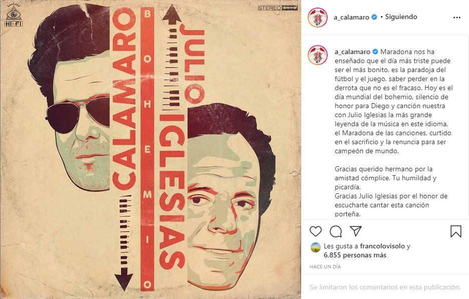 El músico argentino Andrés Calamaro presentó una colaboración musical junto al cantautor español Julio Iglesias. En el material, ambos cantaron el tema musical "Bohemio". Antes de la presentación Calamaro despidió a su amigo Diego Maradona y le pidió que "lo espere en el cielo". También escribió: "Maradona nos ha enseñado que el día más triste puede ser el más bonito, es la paradoja del fútbol y el juego, saber perder en la derrota que no es el fracaso".