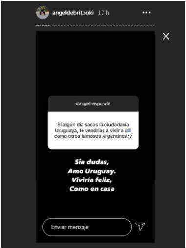 Pero hubo una pregunta que sin duda creó suspicacia en torno al futuro del presentador Ángel de Brito: Un usuario le consultó al conductor sobre la posibilidad de instalarse en el Uruguay. “Si algún día sacás la ciudadanía uruguaya, ¿te vendrías a vivir a Uruguay como otros famosos argentinos?” A lo que el periodista no solo contestó sino que hizo pública la respuesta: “Sin dudas”, contestó el animador de LAM y Cantando 2020. Además agregó: “Amo Uruguay. Viviría feliz, como en casa”.