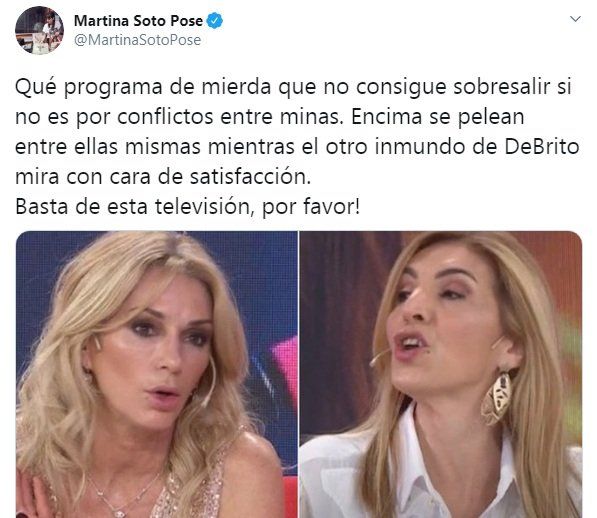 "Qué programa de mierda que no consigue sobresalir si no es por conflictos entre minas", escribió en la red social, al tiempo que criticó la actitud del también conductor del Cantando 2020 frente a este hecho: "Encima se pelean entre ellas mismas mientras el otro inmundo de De Brito mira con cara de satisfacción", dijo sin filtro y cerró contundente: "Basta de esta televisión, ¡por favor!".