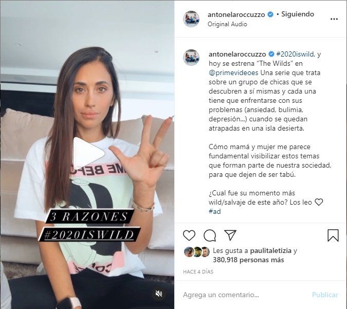 Desde la cuenta de Antonela Roccuzzo se puede leer: “Hoy se estrena “The Wilds”, una serie que trata sobre un grupo de chicas que se descubren a sí mismas y cada una tiene que enfrentarse con sus problemas (ansiedad, bulimia, depresión...) cuando se quedan atrapadas en una isla desierta. Cómo mamá y mujer me parece fundamental visibilizar estos temas que forman parte de nuestra sociedad, para que dejen de ser tabú ¿Cuál fue su momento más wild/salvaje de este año? Los leo”, indica el texto.