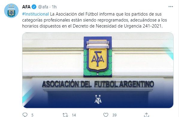 Desde la AFA se comunicó el cambió en el cronograma correspondiente a la fecha diez de la Copa de la Liga Argentina: “La Asociación del Fútbol informa que los partidos de sus categorías profesionales están siendo reprogramados, adecuándose a los horarios dispuestos en el Decreto Nacional de Urgencia 241-2021″