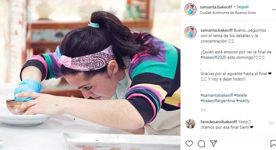 "¿Quién está ansioso por ver la final de #bakeoff2020 este domingo? Gracias por el aguante hasta el final. Y voy a dejar todo!!!", escribió Samanta quien se ha visto inmersa en la crítica de los televidentes del reality de cocina.