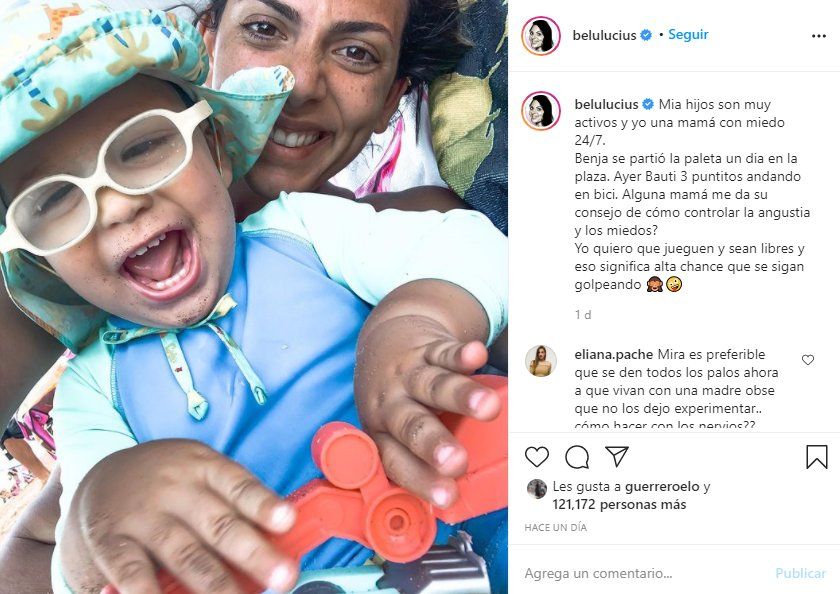Luego la también aspirante a Masterchef Celebrity Argentina Belu Lucius, compartió una foto donde se la ve abrazada a uno de sus hijos, y hasta le pidió consejos a sus seguidores acerca de la paternidad: “Mis hijos son muy activos y yo una mamá con miedo 24/7. Benja se partió la paleta un día en la plaza. Ayer Bauti 3 puntitos andando en bici. ¿Alguna mamá me da su consejo de cómo controlar la angustia y los miedos? Yo quiero que jueguen y sean libres y eso significa alta chance que se sigan golpeando”.