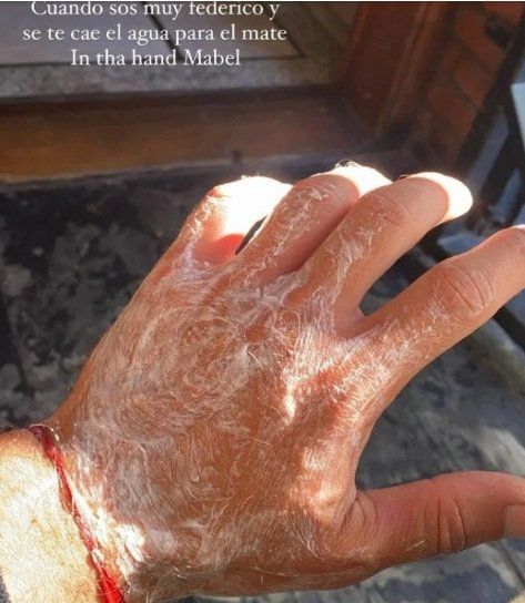 En sus historias de la red social, el actor contó que que tuvo que colocarse crema cicatrizante tras el episodio que no pasó a mayores. "Cuando sos federico y se te cae el agua para el mate in the hand Mabel". Luego con emojis de enojo agrgeó: ¿Tu mañana bien?", escriibió junto a la imagen donde se puede apreciar su mano.