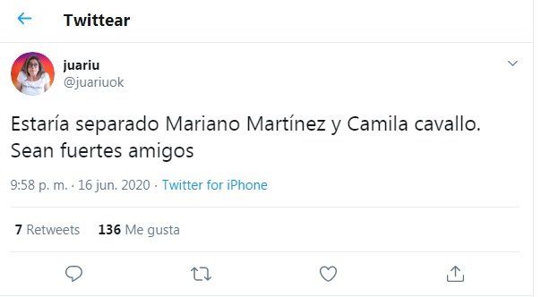 La también instagramer, escribió "Estaría separado Mariano Martínez y Camila Cavallo. Sean fuertes amigos", desde su cuenta en Twitter @juariuok. La panelista reveló que la modelo de 26 años se habría mudado de casa del actor de 41 años edad. Vivían juntos en un departamento en Palermo, con su hija Alma de 3 años. Cabe destacar que el actor Mariano Martínez también es papá de Olivia y Milo, frutos de su matrimonio anterior con Juliana Giambroni.