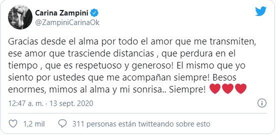 "Gracias desde el alma por todo el amor que me transmiten, ese amor que trasciende distancias, que perdura en el tiempo, que es respetuoso y generoso. El mismo que yo siento por ustedes que me acompañan siempre. Besos enormes, mimos al alma y mi sonrisa siempre", escribió Carina Zampini a sus redes sociales algunas horas después.