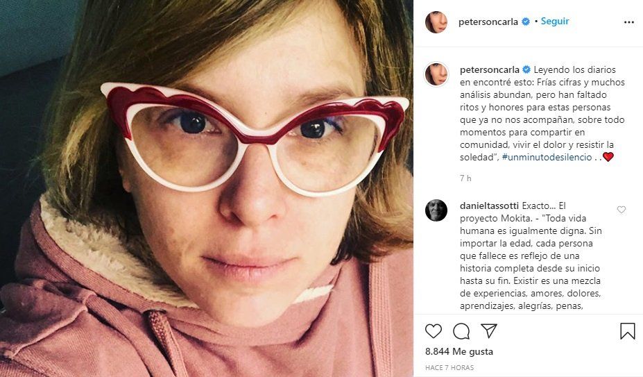 Hace unos días, Carla Peterson usó su cuenta de Instagram para recordar a los fallecidos por la pandemia de coronavirus con un fragmento de un texto y un pedido para sus seguidores.