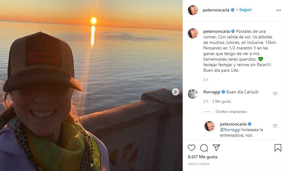 “Postales de una runner. Con salida de sol, río, árboles de muchos colores, all inclusive”, escribió junto a las imágenes. Esta vez recorrió 13 kilómetros. “Pensando en medio maratón y en las ganas que tengo de ver a mis, llamemos, seres queridos”, escribió la actriz que posó con su ropa deportiva y un look renovado. “Festejar, festejar y reírme sin parar!!!! Buen día para ustedes”, cerró Carla Peterson.