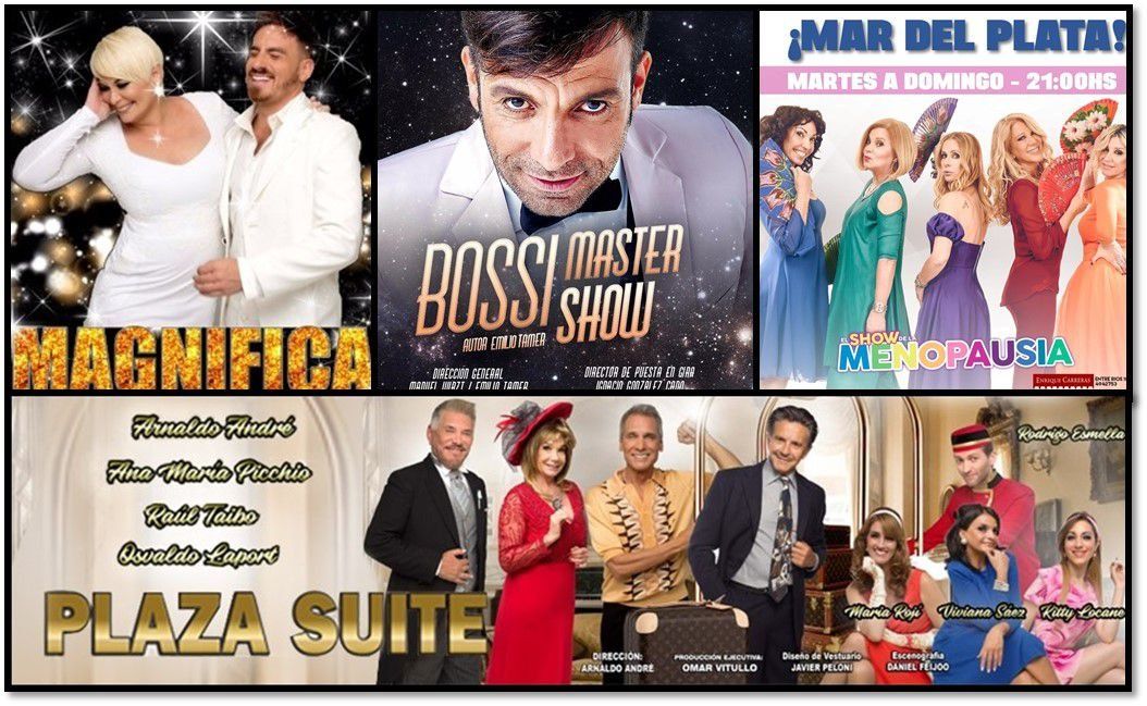 Las obras que siguen de largo son "Bossi Master Show", "Magnífica", "Plaza Suite", "El show de la menopausia". Estas cuatro obras no paran hasta fin de marzo esperando los turistas de semana santa.