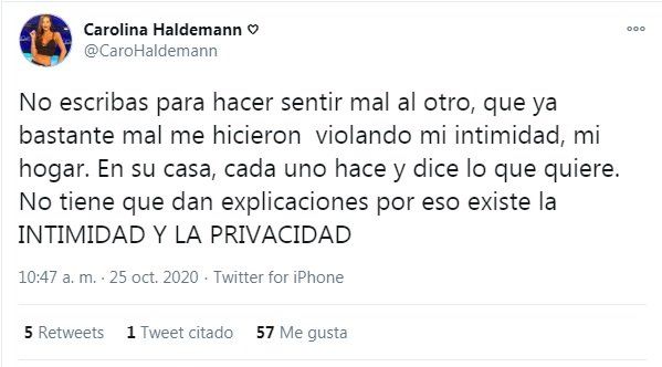 Carolina Haldemann decidió pronunciarse en su cuenta de Twitter tras recibir críticas por el video que se filtró luego del hackeo a su computadora