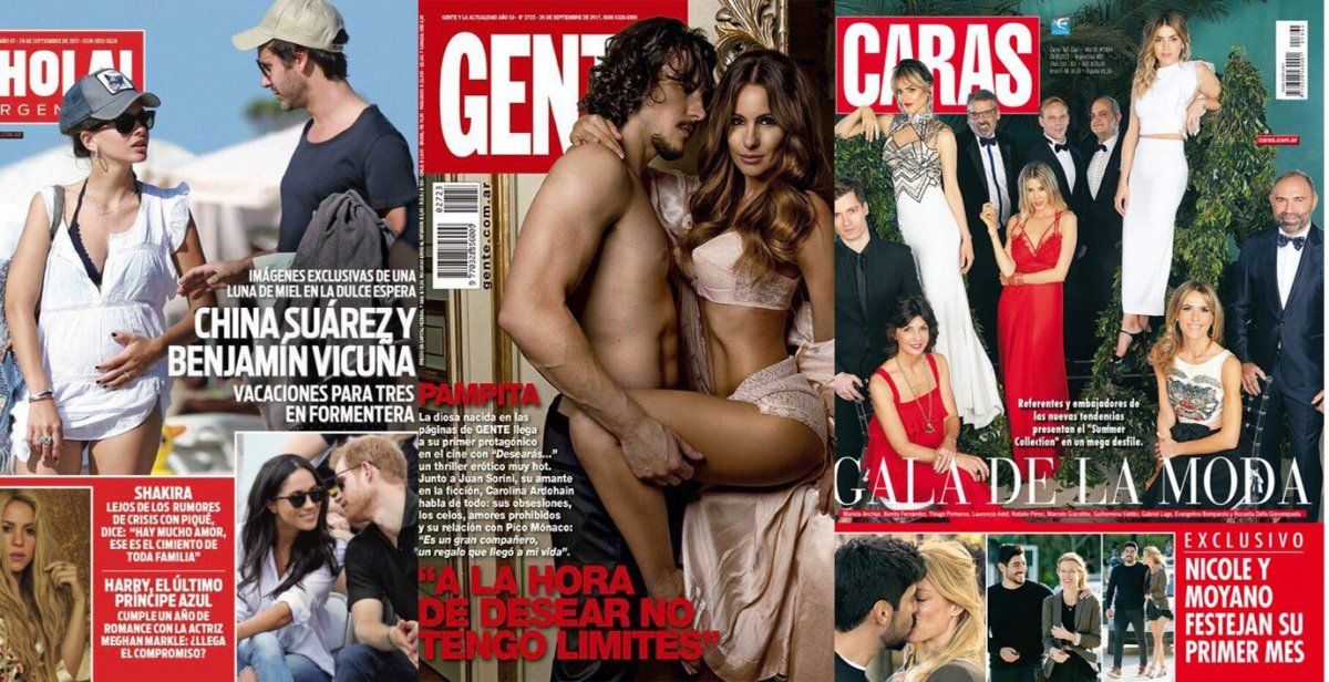 Tapas enfrentadas: Gente con Pampita y su galán y Hola con la China y Vicuña; Gala de moda para Caras