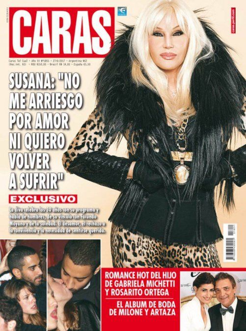 Susana Giménez es tapa en la revista Caras, habla de "no arriesgarse por amor por temor a sufrir", también están Milone y Artaza y su boda soñada y el romance de Rosario Ortega y el hijo de Michetti.