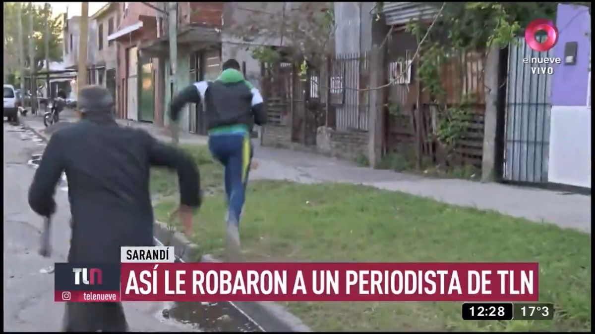 El cronista de Telenueve Diego de Marco fue asaltado mientras hacía su reporte desde la localidad de Sarandi, en el Conurbano de Buenos Aires. Minutos antes de salir al aire, un ladrón pasó corriendo y le arrebató el celular que tenía en la mano.