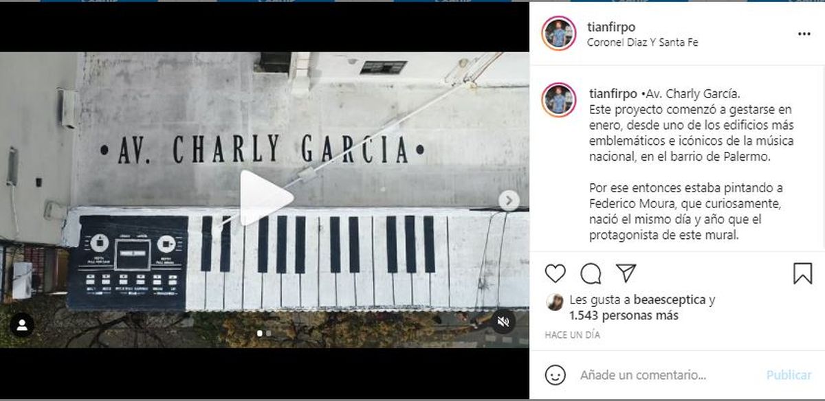 Acerca de su obra homenaje al músico Charly García Tian Firpo explicó: “Este proyecto comenzó a gestarse en enero, desde uno de los edificios más emblemáticos e icónicos de la música nacional, en el barrio de Palermo. Por ese entonces estaba pintando a Federico Moura que, curiosamente, nació el mismo día y año que el protagonista de este mural”. Explicó en sus redes el artista.