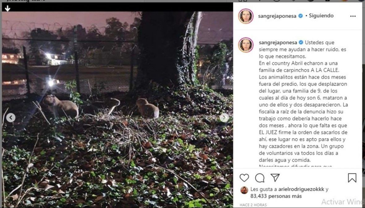 "Ustedes que siempre me ayudan a hacer ruido, es lo que necesitamos. En el country Abril echaron a una familia de carpinchos A LA CALLE", comenzó el texto del posteo de Instagram de La China que obtuvo más de 150 mil likes.