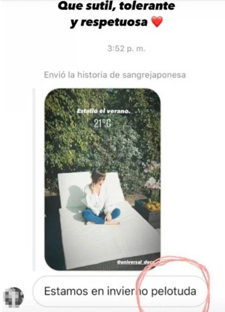 En la postal publicada en las historias de Instagram, La China aparece sentada en la reposera, luciendo unos jeans y una blusa blanca. Pero lo que llamó la atención de la mujer fue el epígrafe de la foto y ante eso le envió un mensaje privado que luego reveló. "Estamos en verano, pelotuda", fue el mensaje que le hizo llegar la usuaria y al que la China respondió tajante: "Qué sutil, tolerante y respetuosa", escribió.