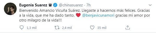 La noticia del nacimiento del nuevo integrante de la familia Vicuña Suárez se volivó tendencia en Twitter. Muchos usuarios felicitaron a la pareja. "Bienvenido a este mundo covidoso por el momento, por suerte no es siempre así y van a poder disfrutarlo en breve. Felicidades para la familia!!! Te quiero", "Bienvenido !!! Gracias a Dios tiene el amor de padres y hermanos que necesita y feliz agarrado a su teta y vos @chinasuarez te felicito por seguir dando vida Amancio ya da calma el nombre !!! ( a no dar bolilla a los sin vida que critican todooo)", fueron algunos de los comentarios.