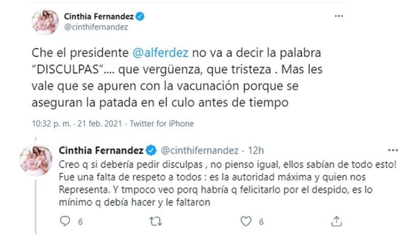 Luego de los comentarios, Cinthia Fernández retrucó: “Creo que sí debería pedir disculpas. No pienso igual, ¡ellos sabían de todo esto! Fue una falta de respeto a todos: es la autoridad máxima y quién nos representa; y tampoco veo porqué habría que felicitarlo por el despido, si es lo mínimo que debía hacer”, retrucó en un nuevo tuit.