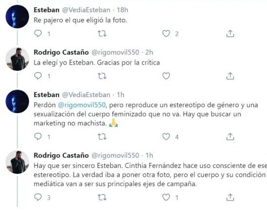 La contienda empezó cuando Rodrigo Castaño compartió una nota sobre el tema ilustrada con una foto de Cinthia posando en ropa interior y se desató un ida y vuelta con algunos detractores. “Re paje... el que eligió la foto”, remarcó un hombre en la red, a lo que el primero aclaró que había sido él. “Perdón, pero reproduce un estereotipo de género y una sexualización del cuerpo feminizado que no va. Hay que buscar un marketing no machista”, explicó el otro.