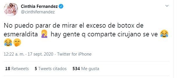 "No puedo parar de mirar el exceso de botox de Esmeraldita... hay gente que comparte cirujano se ve", fue el comentario que hizo Cinthia Fernández en la red social, donde inmediatamente los internautas opinaron al respecto: "Comentarios así deberías tragártelo. Mujer hablando mal de otra mujer" y "No se opina de otros cuerpos, deconstruite", fueron algunos de ellos.