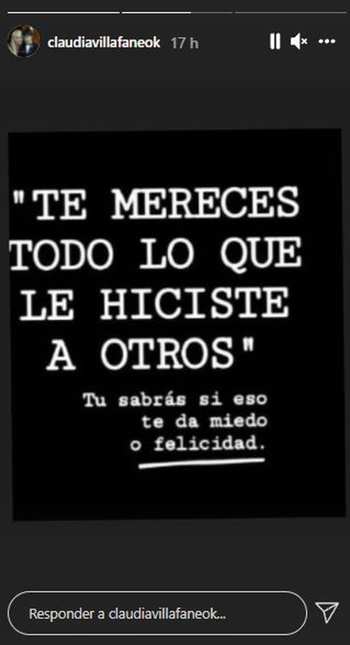 A través de una Instagram Storie, la empresaria Claudia Villafañe escribió: “Te merecés todo lo que le hiciste a otros. Tú sabrás si eso te da miedo o felicidad…” la gran pregunta es ¿A quién fue dirigido este mensaje".