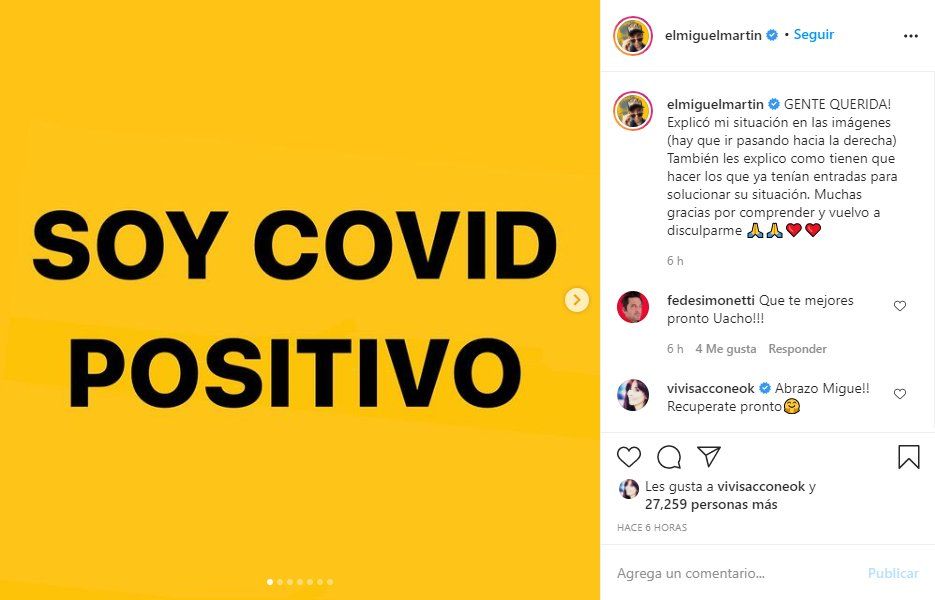 A través de sus redes sociales, Martín, es decir el Oficial Gordillo escribió: "Soy covid positivo". Además el actor compartió un comunicado explicándole la situación a sus seguidores. "¡Gente querida! Nunca pensé que me iba a tocar. Como la gran mayoría, tomé todas las precauciones desde marzo hasta hoy", escribió.
