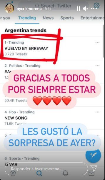 Tras agradecer el apoyo de los fanáticos de la tira Rebelde Way, Cris Morena escribió: ”Muy emocionada por todo su amor siempre-”, también Morena explicó que la noticia tiene que ver con el regreso de Erreway, la banda sonora que formaron los cuatro actores. Durante las dos temporadas que Rebelde Way, sacaron dos discos, y en 2004, aunque la ficción ya había llegado a su fin, el grupo musical siguió de gira y lanzó otro material.