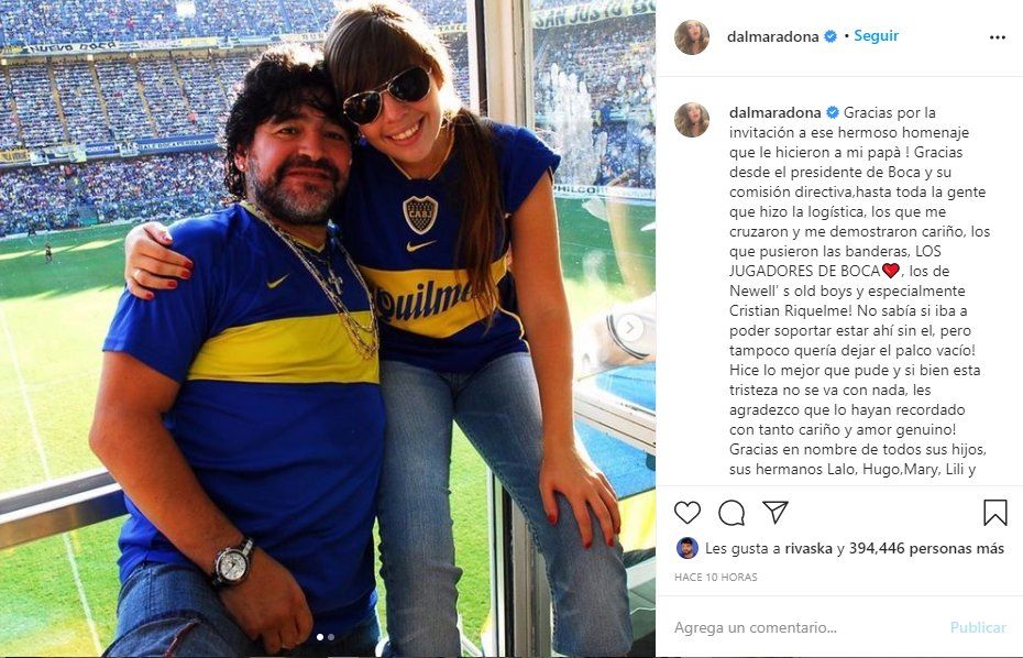 La hija mayor de fallecido jugador y ex Director Técnico de Gimnasia y Esgrima de La Plata Diego Maradona, Dalma Maradona, escribió un sentido mensaje a través de sus redes sociales para agradecer a Boca Juniors por el homenaje que hicieron a su padre: “Gracias por la invitación a ese hermoso homenaje que le hicieron a mi papá!”.