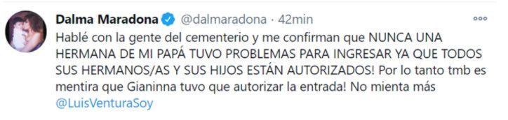 Tras las declaraciones de Ventura, Dalma Maradona no tardó en responderle al periodista a través de su cuenta Twitter: “Hablé con la gente del cementerio y me confirman que NUNCA UNA HERMANA DE MI PAPÁ TUVO PROBLEMAS PARA INGRESAR YA QUE TODOS SUS HERMANOS/AS Y SUS HIJOS ESTÁN AUTORIZADOS! Por lo tanto tmb es mentira que Gianinna tuvo que autorizar la entrada! No mienta más @LuisVenturaSoy”.