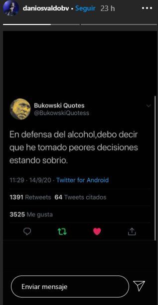 En las últimas horas y luego de que aparecieran imagenes de Jimena Barón y Mauro Caiazza, Daniel Osvaldo escribió en su cuenta de Instagram, una frase del poeta y escritor alemán Charles Bukowski. "Para escribir de amor tienes que estar enamorado o con el corazón roto. No sé cuál de las dos es peor”.Fue el mensaje posteado por Osvaldo. ¿Será que está sufriendo?
