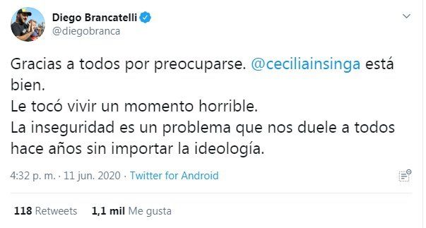 "Gracias a todos por preocuparse. Cecilia Insinga está bien. Le tocó vivir un momento horrible. La inseguridad es un problema que nos duele a todos hace años sin importar la ideología", escribió en la red social.
