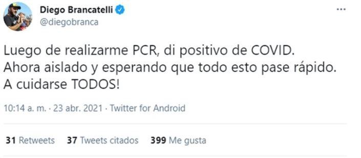 A través de las redes sociales, el periodista militante Diego Brancatelli escribió: “Luego de realizarme PCR, di positivo de Covid. Ahora aislado y esperando que todo esto pase rápido. ¡A cuidarse todos!”. Se conoció que Brancatelli se hizo el hisopado se iba de vacaciones junto a sus familia. porque planeaba irse de vacaciones junto a su familia. Por ahora el periodista no presenta síntomas y desde la producción de Intratables ya están tomando acciones para preservar al resto del equipo.