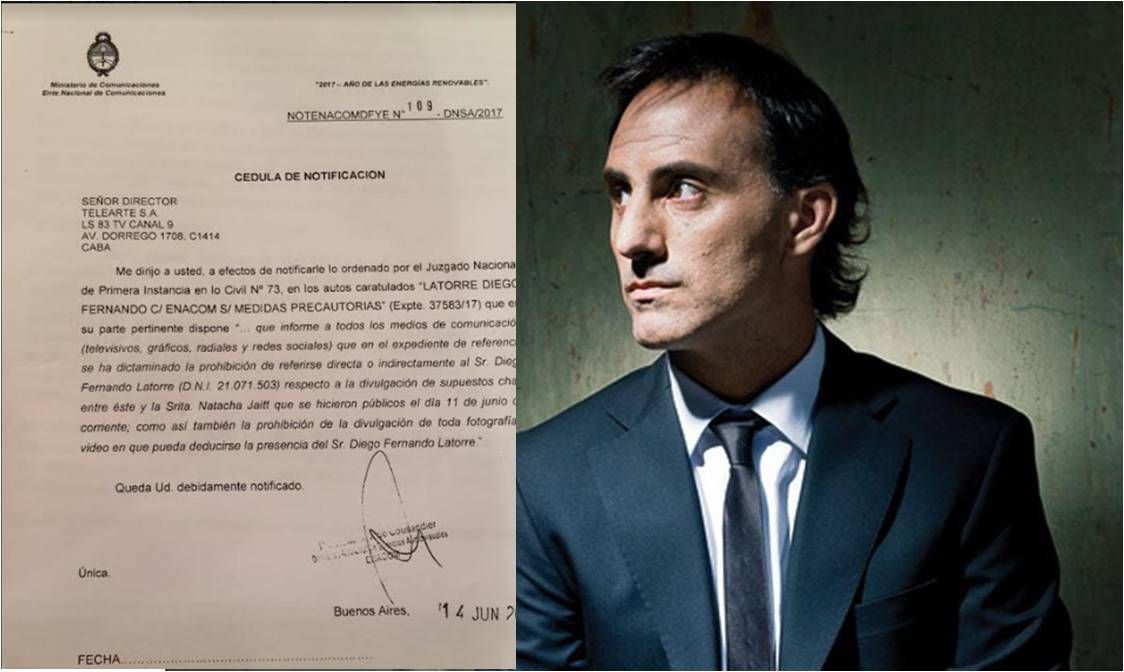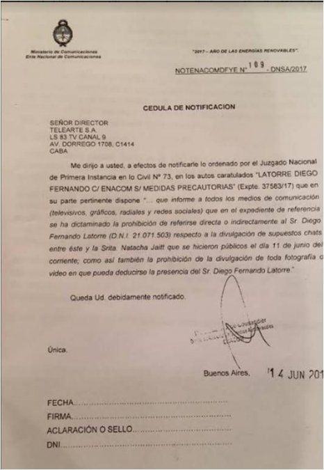 "El Juzgado Nacional de Primera Instancia en lo Civil N°73, en los autos caratulados ´Latorre, Diego Fernando c/ Enacom s/medidas precautorias)...´ dispone: que informe a todos los medios de comunicación (televisivos, gráficos, radiales y redes sociales) en el expediente de referencia se ha dictaminado la prohibición de referirse directa o indirectamente al Sr. Diego Fernando Latorre ... respecto a la divulgación de supuestos chats entre éste y la Srita. Natacha Jaitt..."
