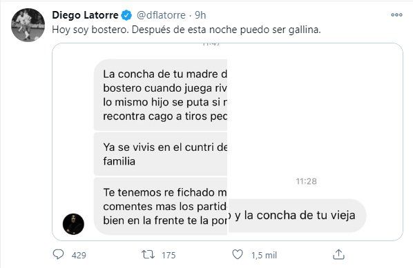 En uno de los primeros posteos compartidos por Diego Latorre se puede leer: “La concha de tu madre, dejá de ser tan bostero cuando juega River, siempre hacés lo mismo hijo de puta, si no la cortás te recontra cago a tiros pedazo de cornudo”, a lo que el comentarista contestó: “Hoy soy bostero. Después de esta noche puedo ser gallina”... En el mismo trino, Diego Latorre mostró el segundo mensaje: “Ya sé. Vivís en el country de Pilar con tu familia. Te tenemos re fichado. Más vale que no comentes más los partidos de River porque bien en la frente te la pongo hijo de puta”, se pudo leer en la cuenta Twitter del ex jugador.