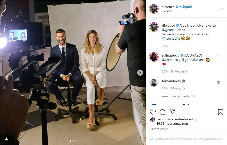Tanto Luciana Geuna como Diego Leuco aparecen en tres fotografías del detrás de escena. En el posteo Leuco aprovechó para recibir a Geuna en el ciclo: "Qué lindo volver a verte @geunaluciana. Se vienen cosas muy buenas en @telenoche". Escribió el hijo de Alfredo Leuco.