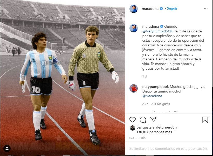 Por lo tanto, su compañero en la Selección y líder de aquel equipo comandado por Carlos Bilardo, Diego Maradona le envió un conmovedor mensaje a través de su cuenta oficial de Instagram.