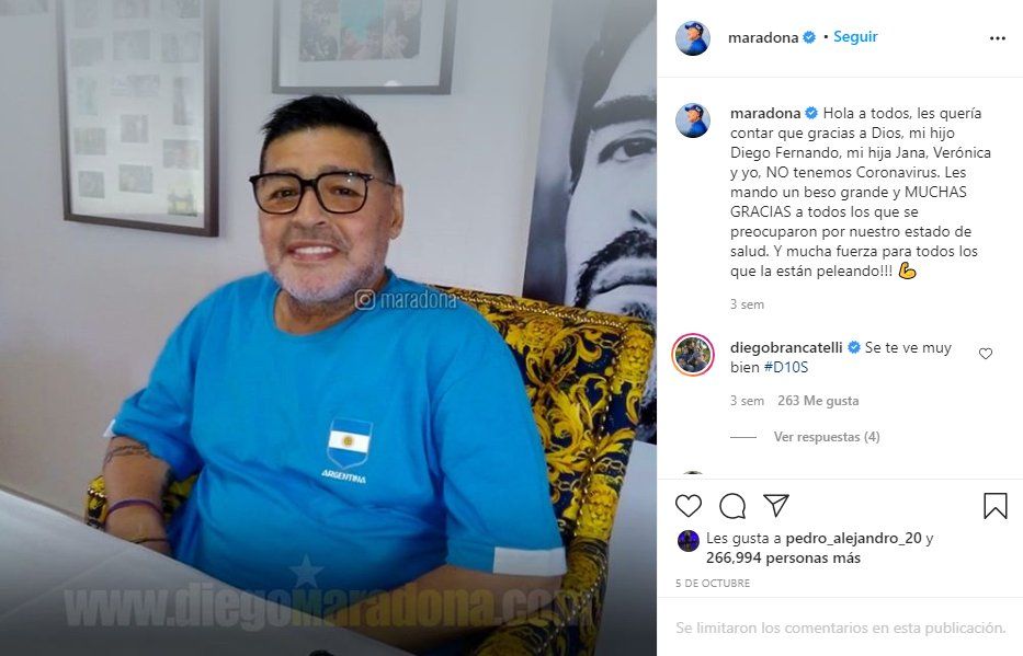 Cabe destacar que Diego Maradona es considerado paciente de riesgo por exceso de peso e hipertensión, tomó todo los recaudos necesarios desde que inició la pandemia del virus Covid 19, conocido también como coronavirus. Hace algunas semanas, el ex jugador también tuvo que practicarse el hisopado, tras tener contacto estrecho con el jugador Nicolás Contín, quien también se contagió.