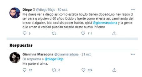 Y entonces la hija del ex astro del futbol, Gianinna, fue contundente con su respuesta: “Me parte el alma”, trinó la madre de Benjamín, visiblemente preocupada.